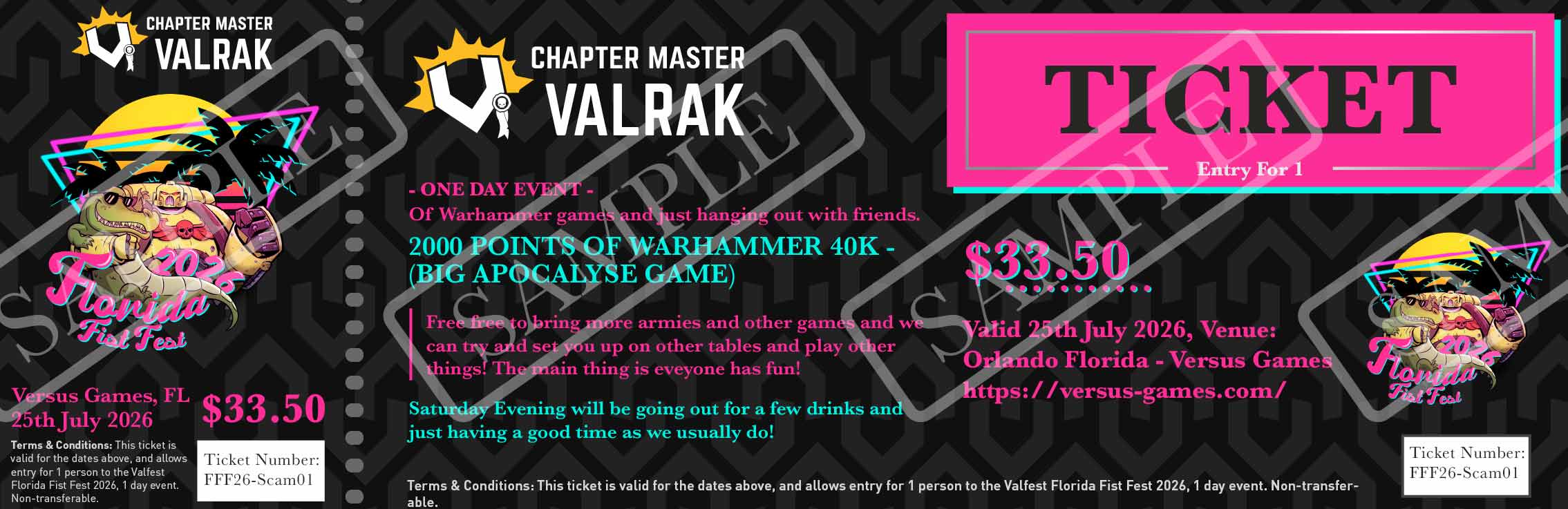 One Day event of Warhammer games and hanging out with friends, be part of our amazing community in real life! If you are buying more than one ticket, please purchase 1 at a time, we need the name per ticket, thanks.